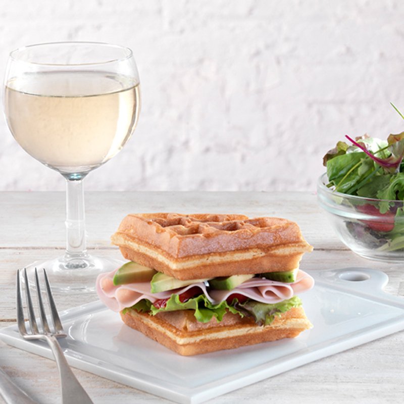Repartir los ingredientes entre dos porciones de gofre recién hechas.